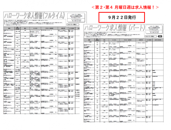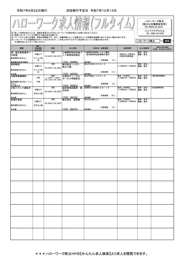 ハローワーク秩父 にて第2、4週の月曜日更新の『求人情報』(フルタイム版&パートタイム版)のご案内です。