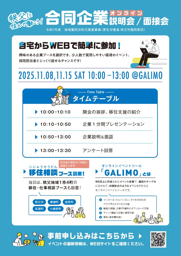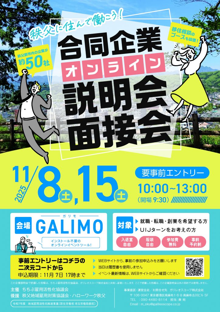 11月8日(土)・11月15日(土)の2日間、秩父地域での就職・転職・創業を希望する方、またUIJターンをお考えの方を対象に『オンライン合同企業説明会/面接会』を開催します。(主催:ちちぶ雇用活性化協議会、後援:秩父地域雇用対策協議会、ハローワーク秩父)
