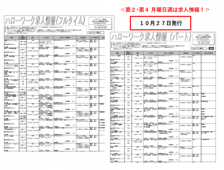 ハローワーク秩父 にて第2、4週の月曜日更新の『求人情報』(フルタイム版&パートタイム版)のご案内です。