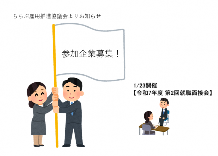 詳しくは、ちちぶ雇用活性化協議会ホームページ 企業向けお知らせ内『【令和7年度 第2回就職面接会】参加企業募集のご案内』にてご確認ください。