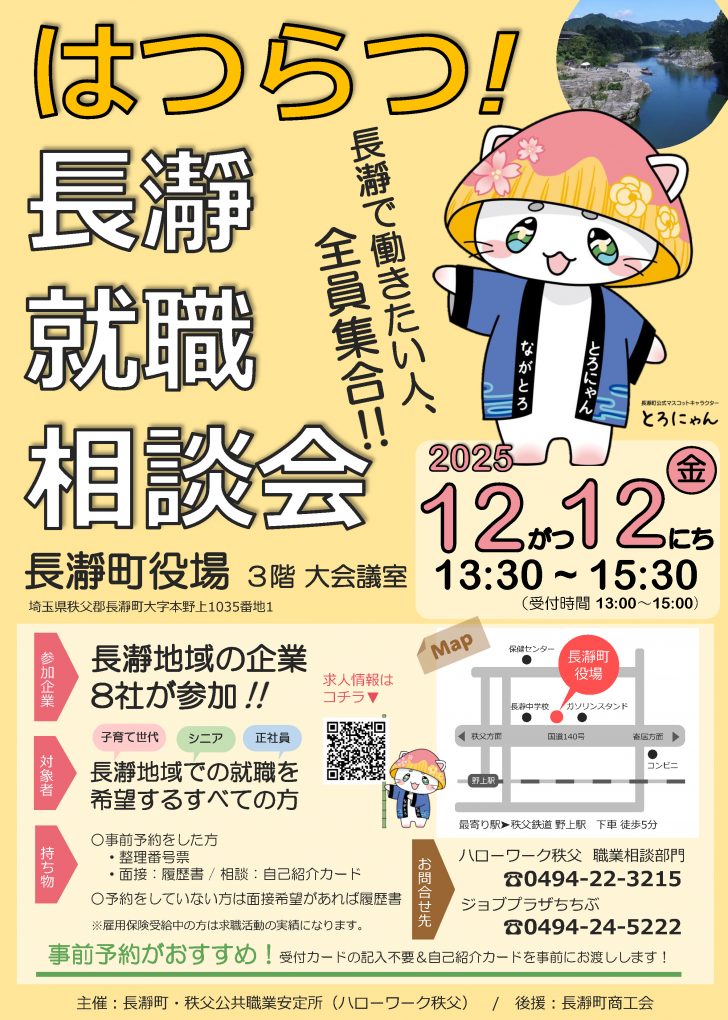 12月12日(金)、長瀞地域での就職を希望する方を対象に『はつらつ!長瀞就職相談会』を開催します。(主催:長瀞町・ハローワーク秩父、後援:長瀞町商工会)