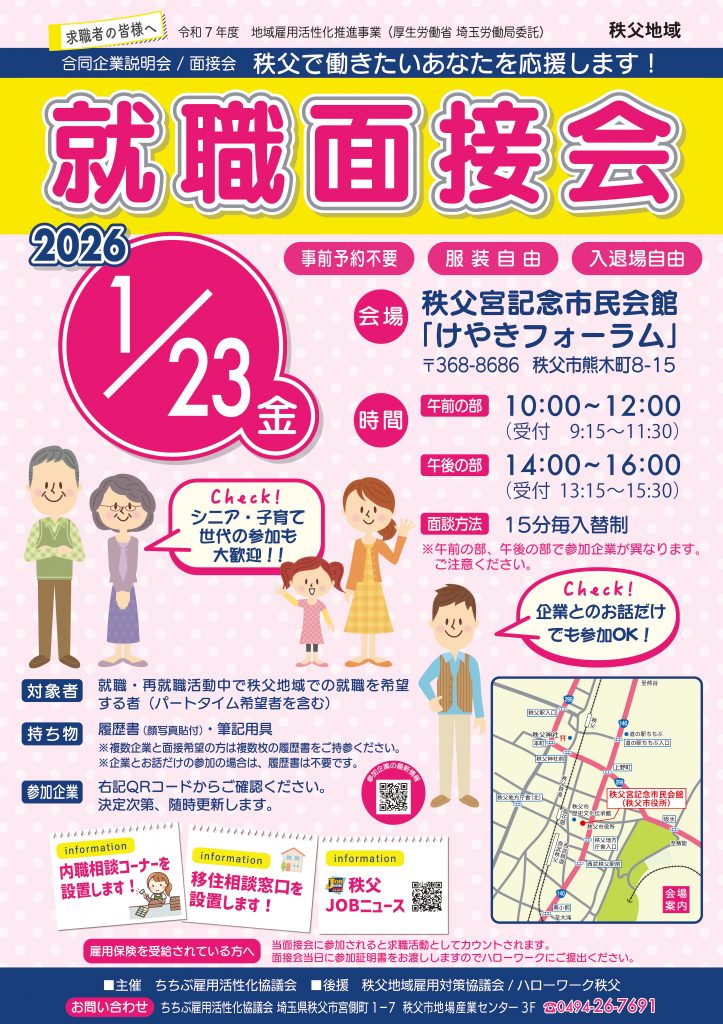 2026年1月23日(金)に「合同就職面接会」を開催いたします。(主催:ちちぶ雇用活性化協議会、後援:秩父地域雇用対策協議会・ハローワーク秩父)