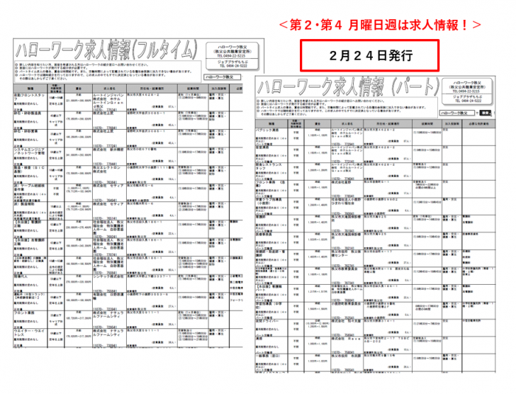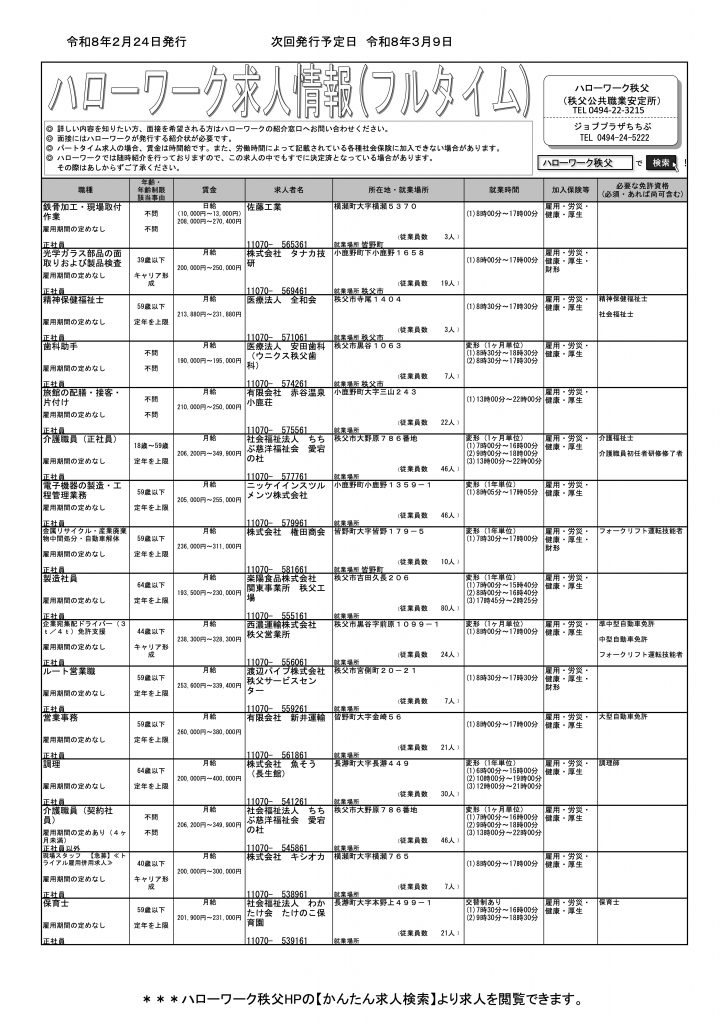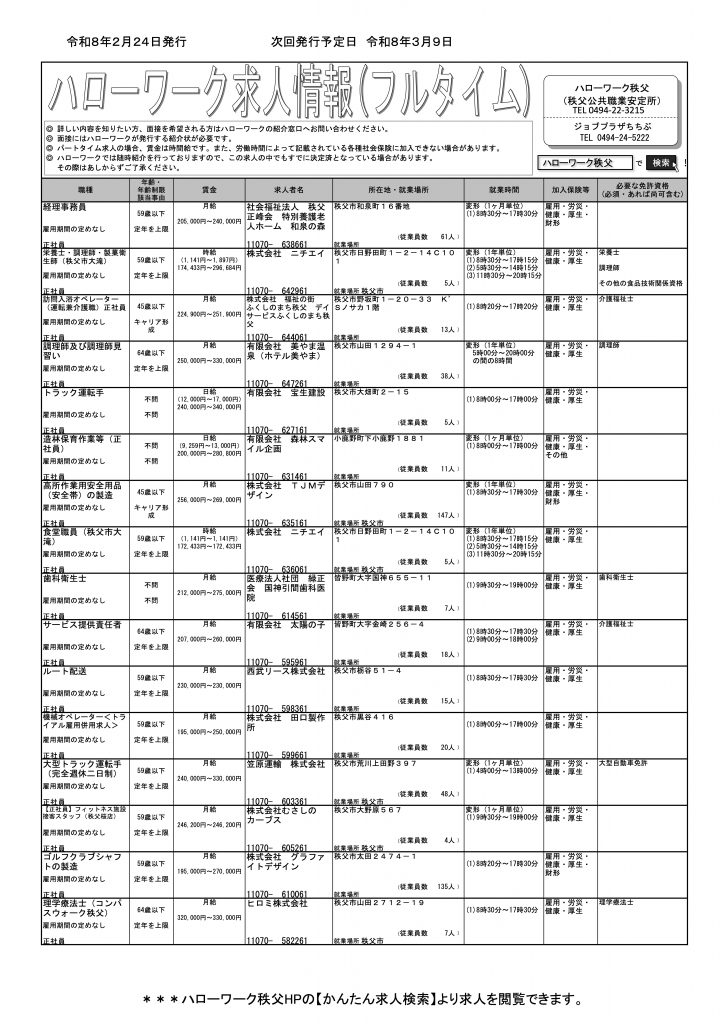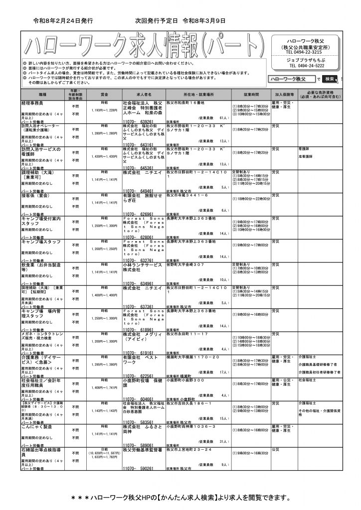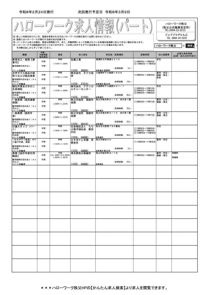 ハローワーク秩父 にて第2、4週の月曜日更新(今週は月曜日が祭日のため、火曜日発行)の『求人情報』(フルタイム版&パートタイム版)のご案内です。