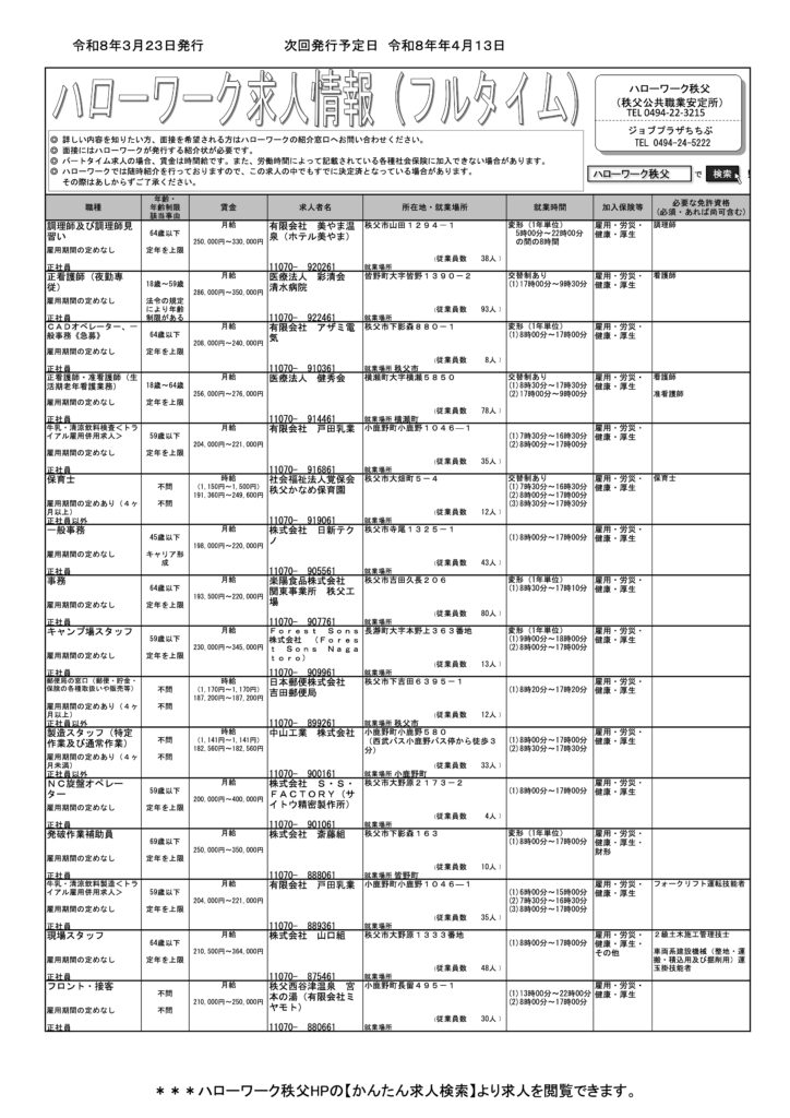 ハローワーク秩父 にて第2、4週の月曜日更新の『求人情報』(フルタイム版&パートタイム版)のご案内です。